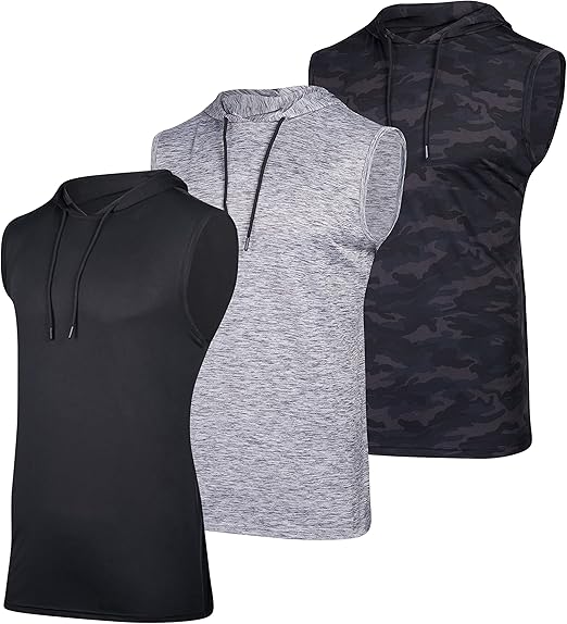 3 Pack: Mens Dry-Fit Active Hooded Tank Top - Workout Sleeveless Hoodie Drawstring